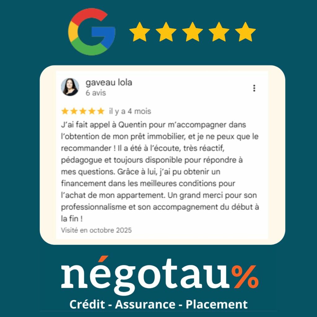Un grand merci à Lola pour cet avis Google 5 étoiles qui met en lumière l’accompagnement proposé par Négotaux.Être à l’écoute, réactif et pédagogue fait partie intégrante de notre engagement auprès de chaque client. Nous sommes ravis d’avoir pu contribuer à la réussite de ce projet immobilier et d’avoir accompagné ce financement du début à […]